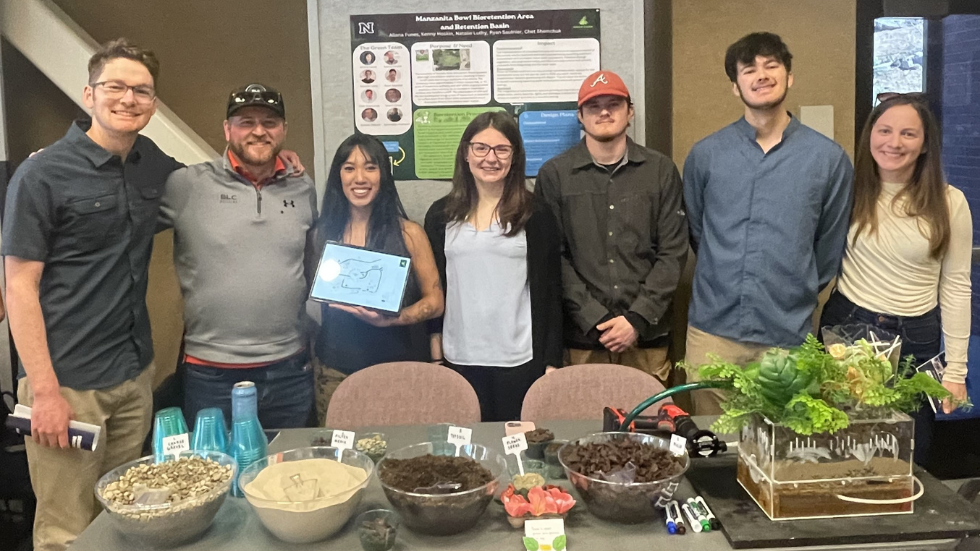 The team designed a bioretention basin at the Manzanita Bowl of the UNR campus to mitigate flooding problems that have recently occurred due to the urbanization of the university and the surrounding area. The bioretention basin cleans polluted stormwater through a filter system before slowly releasing it to natural drainage and creates an environment for local flora to thrive.